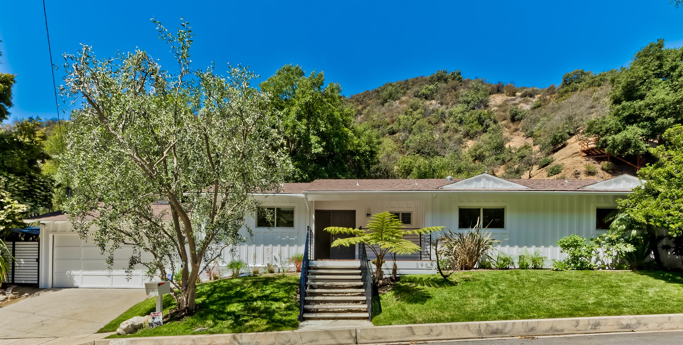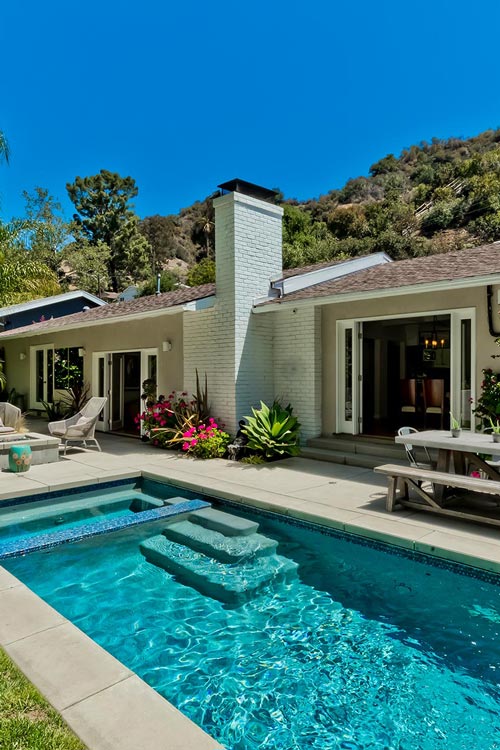 Welcome home to this one story updated California ranch with 3 bedrooms plus 2 bathrooms. Get in touch with nature and enjoy you own personal oasis in the fully fenced private backyard with pool with waterfall, spa, firepit, dining area, built in BBQ, grassy yard, large dog run, and two meditation patios among the mature landscaping. The spacious living room and dining room with bamboo floors each with their own stone-faced fireplace and French doors that open to the backyard creating the perfect indoor-outdoor lifestyle. The spacious kitchen with granite counters and stainless-steel appliances opens to the living room and dining room with high beamed ceilings and a built-in desk area. The primary bedroom with large walk- in closet and ensuite remodeled bathroom also has French doors to the backyard. Two additional bedrooms and bathroom complete the bedroom wing all with hardwood floors. Other features include: 9 security cameras, low voltage backyard lighting, private protected dog area, 2 car direct access garage and plenty of guest parking in front of the house. Bonus private deck sitting area with views up the backyard hill to enjoy from respite from the rest of the family.